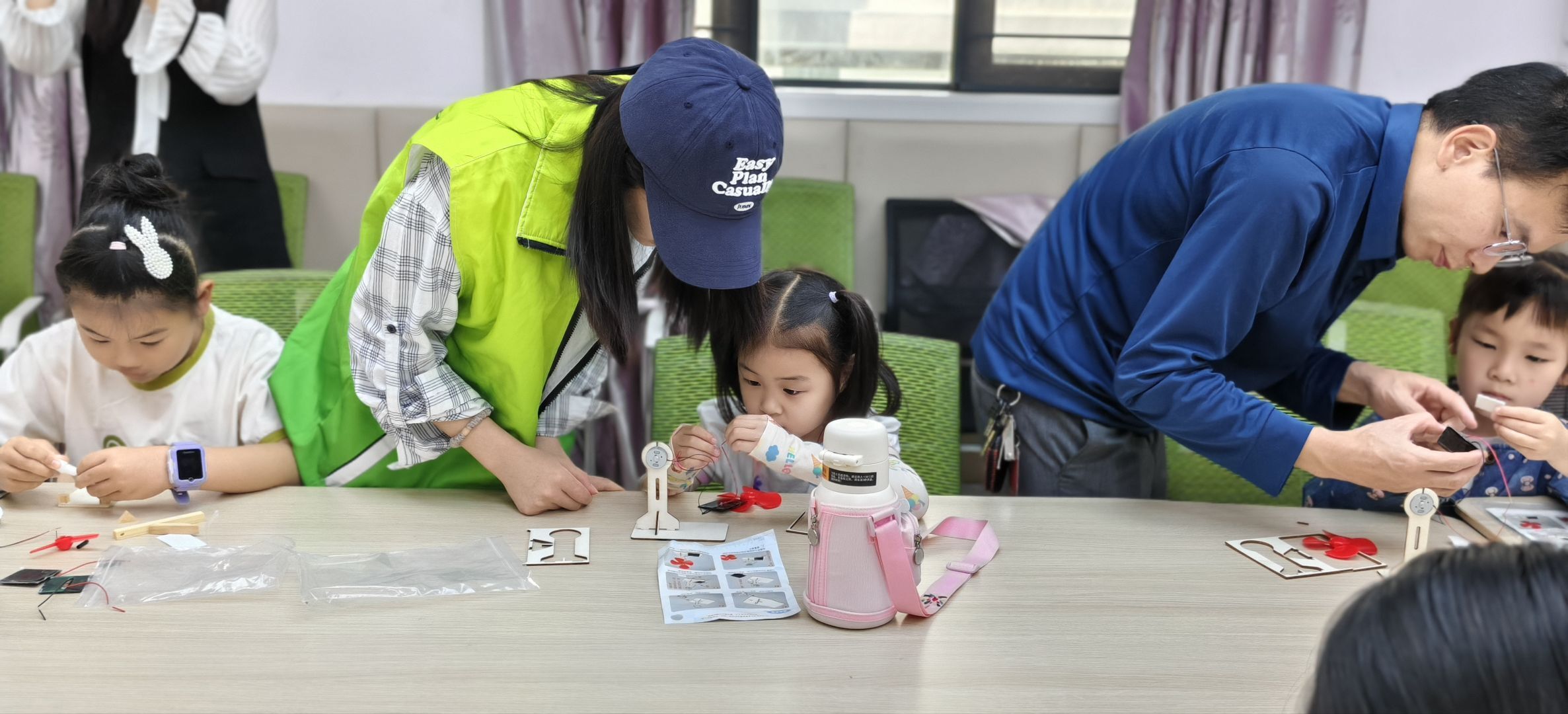 活动现场设置科普讲解、手工制作、成果展示等环节。志愿者以小故事、动画短片与绘本等形式,生动讲解太阳能原理与环保价值,以互动提问激发孩子们的探索热情。在手工实践中,志愿者耐心指导组装太阳能玩具,全程保障操作安全,帮助每位孩子完成作品。作品完成后,孩子们手持成品到户外测试效果,在阳光下见证太阳能驱动玩具运转,直观感受清洁能源魅力。