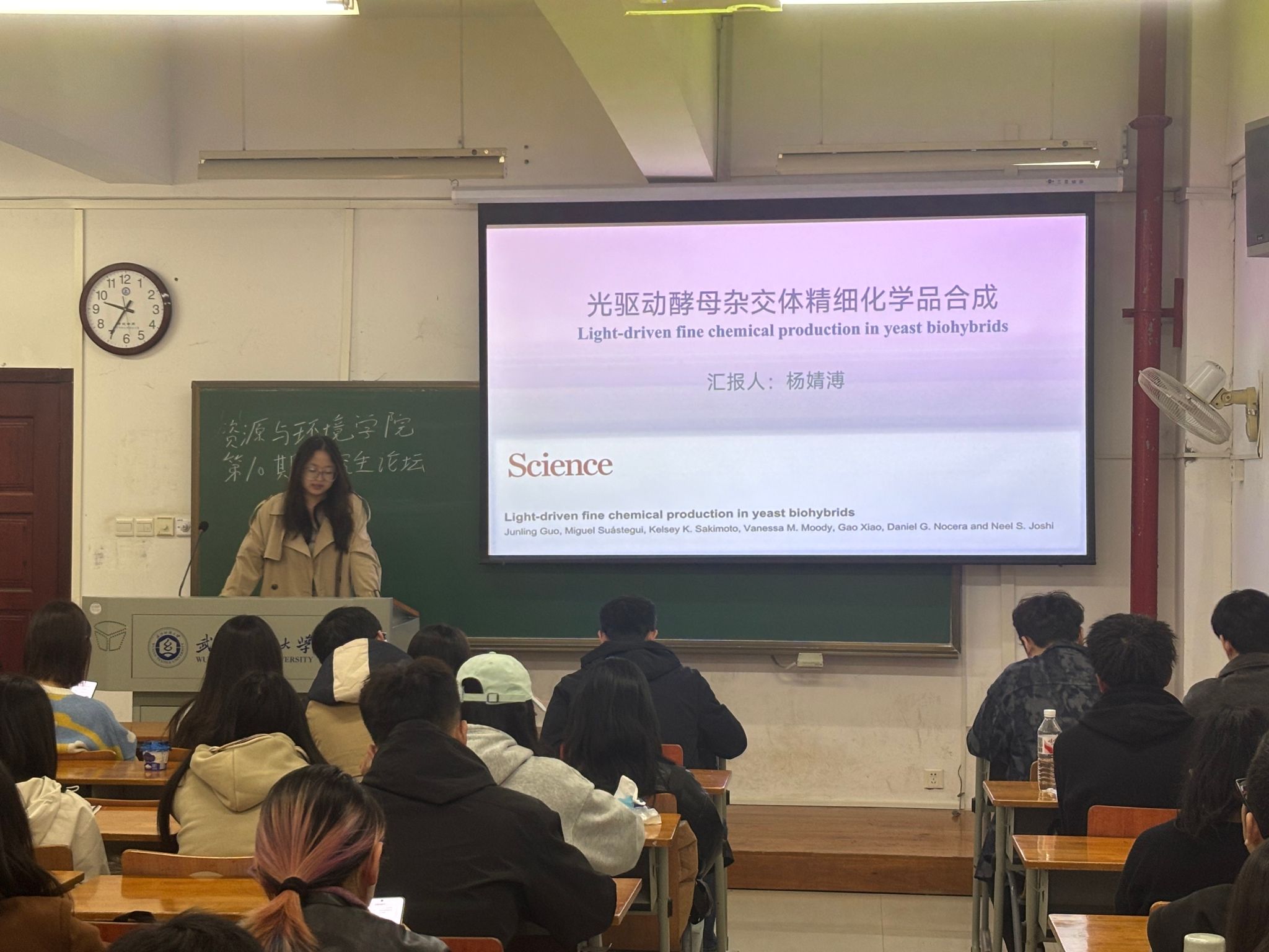 王慧茹同学探讨了该研究受自然光合作用启发,设计了由光诱导电子模块、电子转移通道模块和质子梯度模块组成的光驱动仿生系统。其核心是通过缺陷调控和能带结构工程等策略,实现NADPH和ATP的同步可控供应,解决微生物代谢中二者不足的问题。实验表明,该系统能显著提升沼泽红假单胞菌的CO2固定效率和番茄红素生物合成效率,电子转移效率高达90.8%,光子转化效率提升1.6倍。该系统还适用于大肠杆菌等菌株,为可持续生物制造、CO2减排提供了新路径。