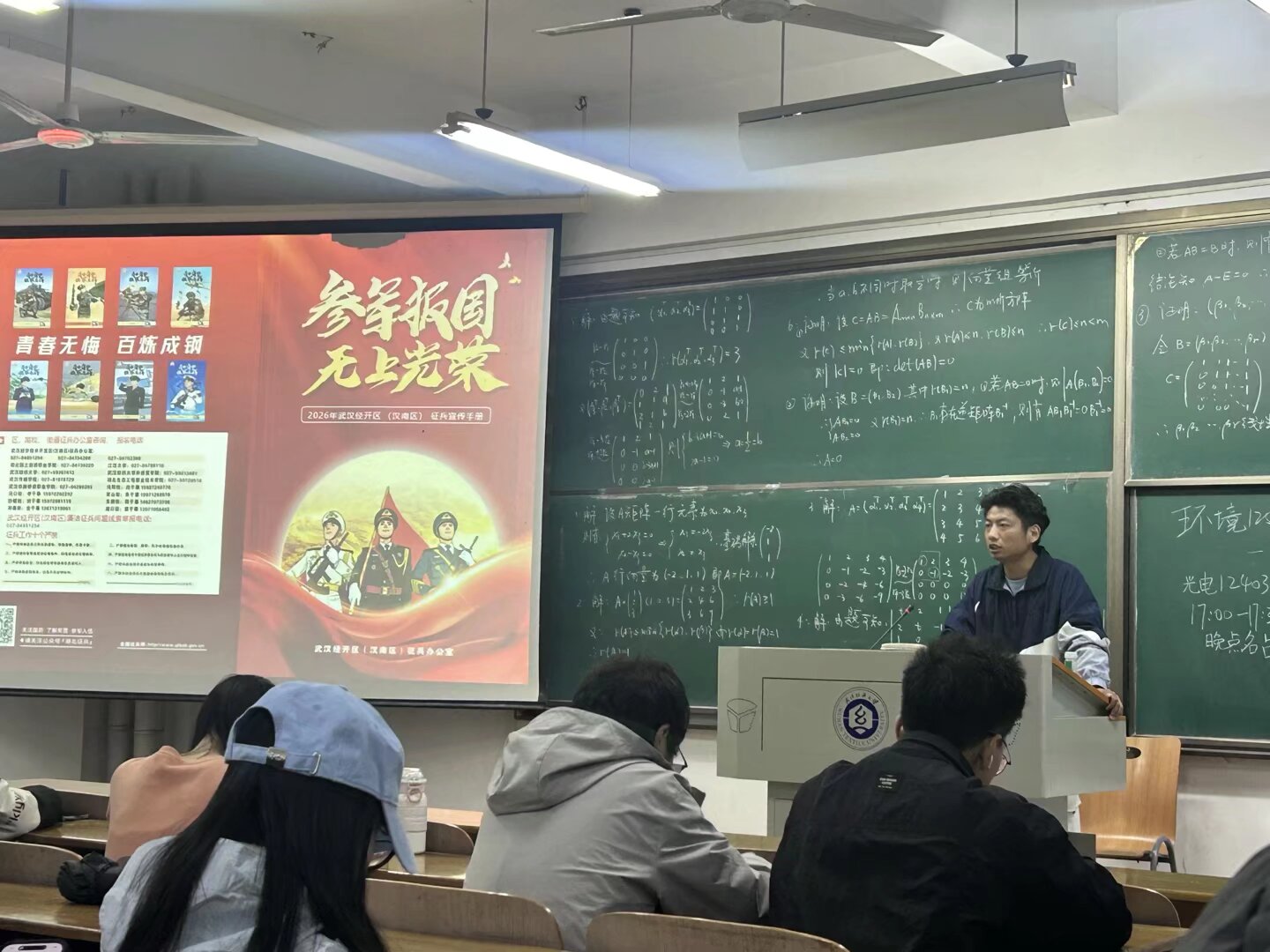 的感受等方面进行分享,让同学们更加直观地感受到军人的风采和担当,号召同学们积极关注征兵工作,激发了同学们的爱国热情和报国志向。同时,组织有报名意愿的同学们加入2026年春季征兵宣传群,方便随时了解征兵政策和报名信息。