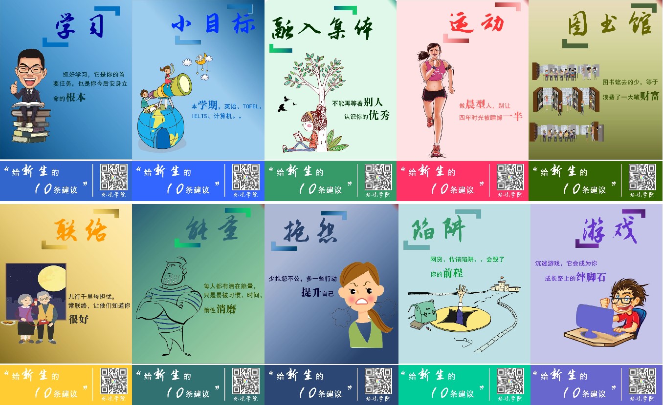 门像一张白纸,四年间要在这张白纸上描绘美好的蓝图,必须系好人生的第一粒扣子。报到前,学院副书记刘园美用并不擅长的技术设计海报,对新生学习、生活、运动等提出了十条建议。