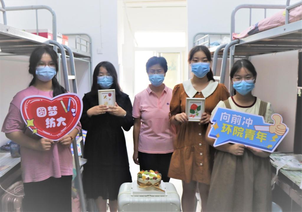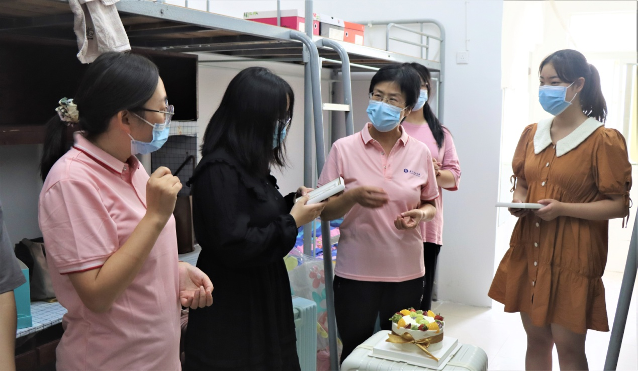 党委书记谢晓萍、副书记姚瑶、新生辅导员郁星为环境12202班田慧美、环境12006班鲁欣雨两位同学准备了生日蛋糕与生日礼物,与班主任老师一同来到了两位女生的宿舍,为她们送上了最真挚的祝福。