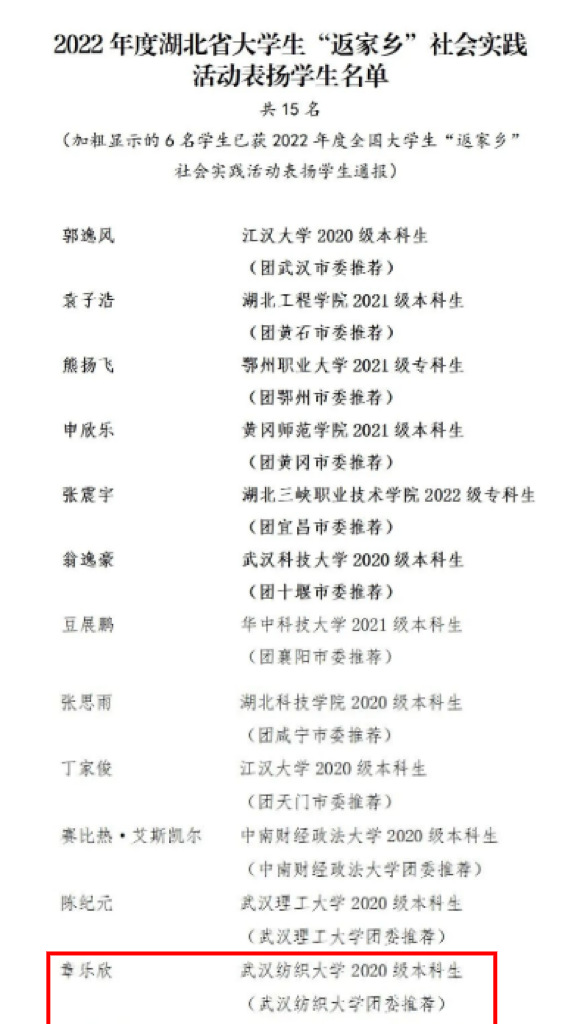 2022年度湖北省大学生“返家乡” 社会实践活旨在引导广大青年学生在家乡的热土上、在实践的课堂中受教育、长才干、作贡献,进一步彰显育人实效。经基层申报、各地各单位团组织推荐、组织评议等环节,对表现突出的17个单位、6名工作者、15名学生、6个项目予以通报表扬,章乐欣是欧美a片