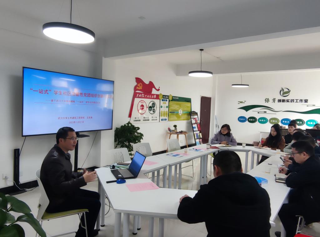 辅导员李文倩、毛成兴分别以《深入学生社区,筑牢基层战斗堡垒--探索学生社区党员先锋岗服务模式》、《学生党员在社区发挥作用的探索--以党员宿舍责任区为例》为题,以十栋“‘绿芽’创新实践学生服务驿站”工作开展为基础,对十栋“一站式”社区党员下沉、党员服务等社区党团建设工作进行了分享。