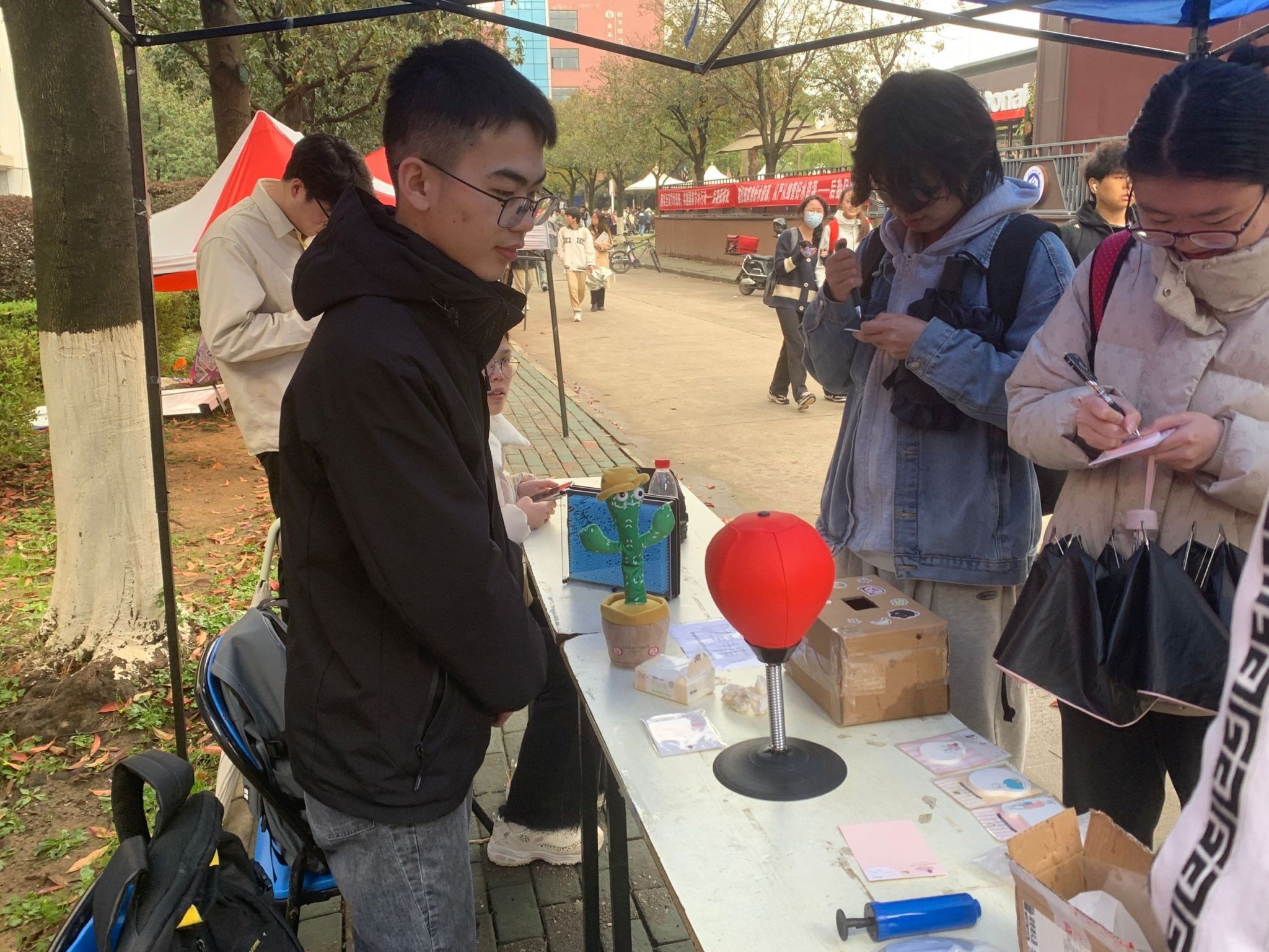 在一食堂北门开展“丢掉烦恼、解决烦恼”贴纸大作战。同学们将心中的烦恼写在便利贴上,成为一张“烦恼纸”,投入“烦恼树洞”箱中,并在其中随意抽取一张“烦恼纸”,写下解决它的方法,二级站工作人员将解决方法反馈给“烦恼纸”的主人,帮助同学们缓解郁闷心情。活动现场还提供了“三维针手摸益智解压”、“减压拳击球”等解压小工具,供同学们释放压力,舒缓身心,更好地生活和学习。