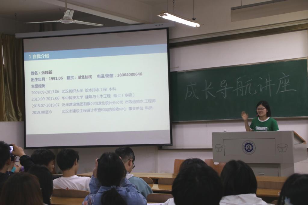 09级校友、武汉市建设工程设计审查和消防验收中心工程师张颖新,以“走出迷茫,坚定前行”为主题,为在场一百余名学生带来了一场精彩的讲座。