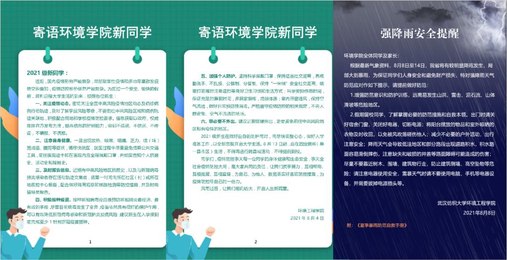 制作了《寄语环境学生新同学》《强降雨安全提醒》等海报,以公告形式发送至新生群,要求同学们点击公告确认收到。提醒大家关注疫情动态、及时报告信息、积极接种疫苗、加强个人防护、非必要不外出等,在条件允许的前提下,适当参与志愿服务活动,展现环境学子的责任与担当。