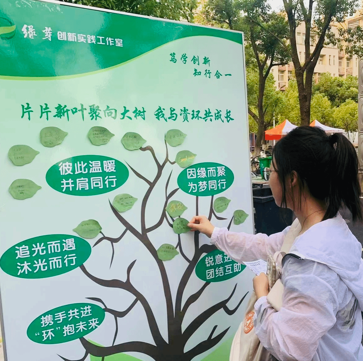 这棵大树上,我将努力汲取养分,让叶更绿,让花更艳,茁壮成长!”环境12404李若男将自己的那片绿叶贴在树干上,十分动容地说。