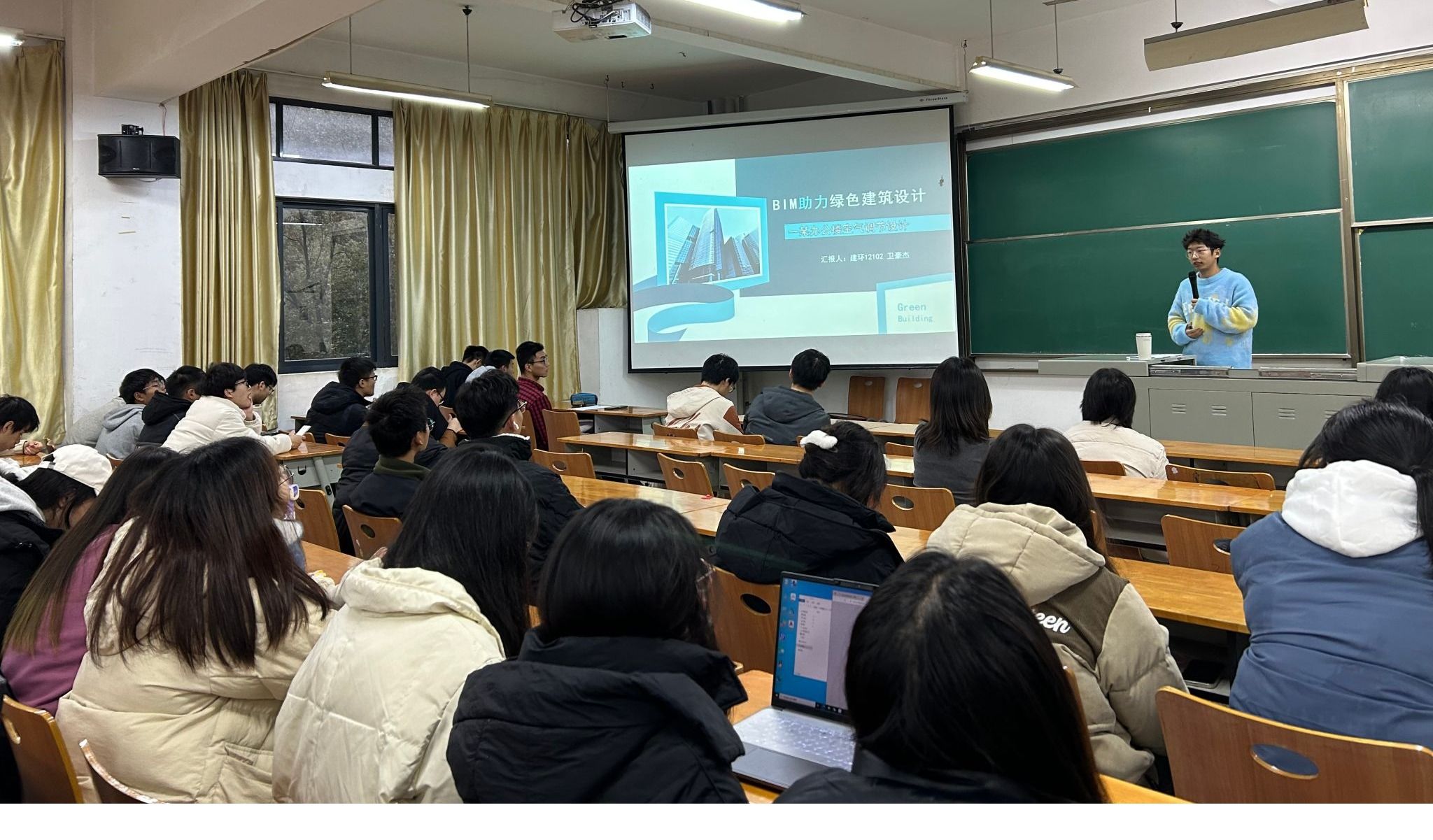 BIM协会代表建环12102班卫豪杰同学介绍了BIM协会的训练内容及获得的各类奖项、获得本届互联网+创新创业大赛校赛铜奖的给排12101班方钧同学以“ZVI—MOS协同除磷和磷回收”为题进行了汇报。