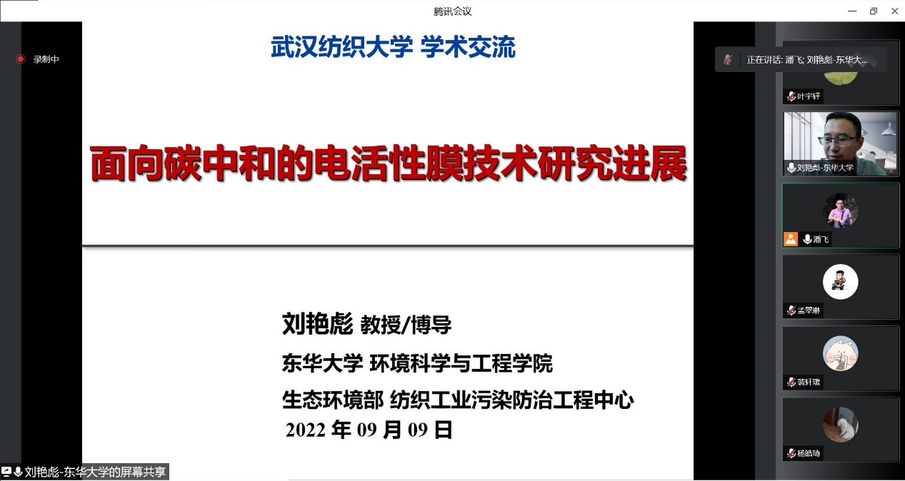 刘艳彪教授解析了印染废水存在的典型污染物种类,分析环境电化学技术在水处理过程中面临的挑战和机遇;针对纺织工业废水中的染料、微污染物以及特征污染物(锑)等,研发了新一代纳米复合导电膜材料;创新性的将膜材料与电化学技术结合,实现污染物的选择性高效去除,揭示膜分离耦合电氧化处理污染物的机理。相关工作得到了国内外知名专家的正面评价和多次引用信息。此外,刘教授还分享了做科研的经验,希望青年教师和学子多写论文,并加强与领域内知名专家的交流合作,努力提升自身的学术水平。
